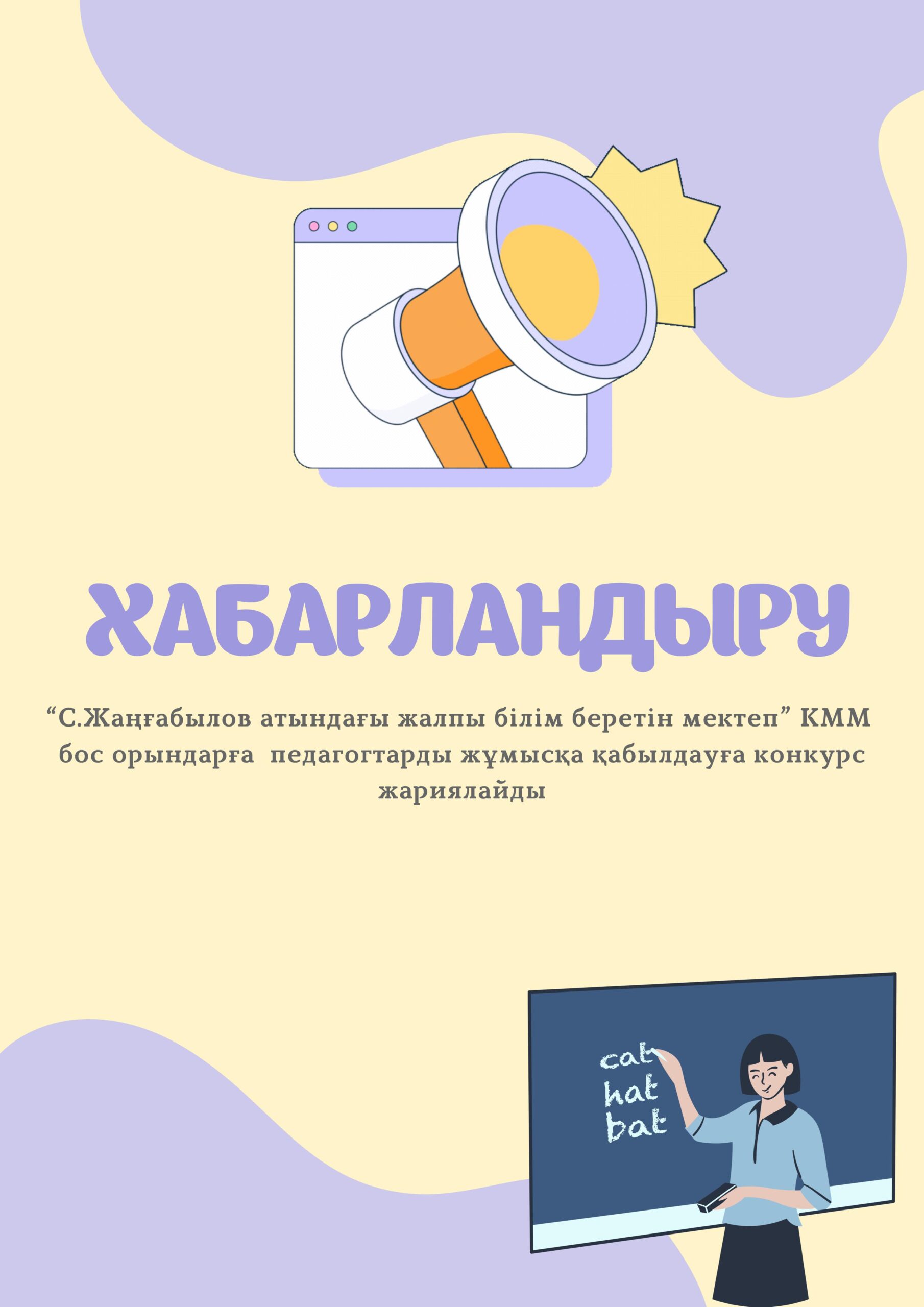 «С.Жаңғабылов атындағы жалпы білім беретін мектеп» КММ Қазақстан Республиксы Оқу-ағарту министрінің 2025 жылғы 31 наурыздағы № 57 және Қазақстан Республикасы Еңбек және халықты әлеуметтік қорғау министрінің 2025 жылғы 31 наурыздағы «Мемлекеттік білім беру ұйымдарының бірінші басшылары мен педагогтерін лауазымға тағайындау, лауазымнан босату қағидаларын бекіту туралы» № 96 бірлескен бұйрығына сәйкес бос орындарға конкурс жариялайды. Конкурсқа қатысатын педагогтар Қазақстан Республикасы Білім және ғылым министрінің 2009 жылғы 13 шілдедегі «Педагог лауазымдарының үлгілік біліктілік сипаттамаларын бекіту туралы» №338 бұйрығында көзделген біліктілік талаптарына сәйкес келуі тиіс. Қазіргі уақытта «Ұлттық білім беру дерекқоры» ақпараттық жүйесіндегі уақытша ақауларға байланысты құжаттарды қабылдау қағаз түрінде 13.08.2025-21.08.2025жыл аралығында жүргізіледі.