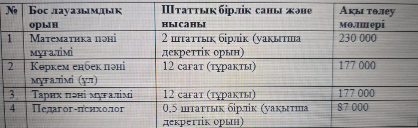 «С.Жаңғабылов атындағы жалпы білім беретін мектеп» КММ Қазақстан Республиксы Оқу-ағарту министрінің 2025 жылғы 31 наурыздағы № 57 және Қазақстан Республикасы Еңбек және халықты әлеуметтік қорғау министрінің 2025 жылғы 31 наурыздағы «Мемлекеттік білім беру ұйымдарының бірінші басшылары мен педагогтерін лауазымға тағайындау, лауазымнан босату қағидаларын бекіту туралы» № 96 бірлескен бұйрығына сәйкес бос орындарға конкурс жариялайды. Конкурсқа қатысатын педагогтар Қазақстан Республикасы Білім және ғылым министрінің 2009 жылғы 13 шілдедегі «Педагог лауазымдарының үлгілік біліктілік сипаттамаларын бекіту туралы» №338 бұйрығында көзделген біліктілік талаптарына сәйкес келуі тиіс. Қазіргі уақытта «Ұлттық білім беру дерекқоры» ақпараттық жүйесіндегі уақытша ақауларға байланысты құжаттарды қабылдау қағаз түрінде 25.08.2025-02.09.2025жыл аралығында жүргізіледі.